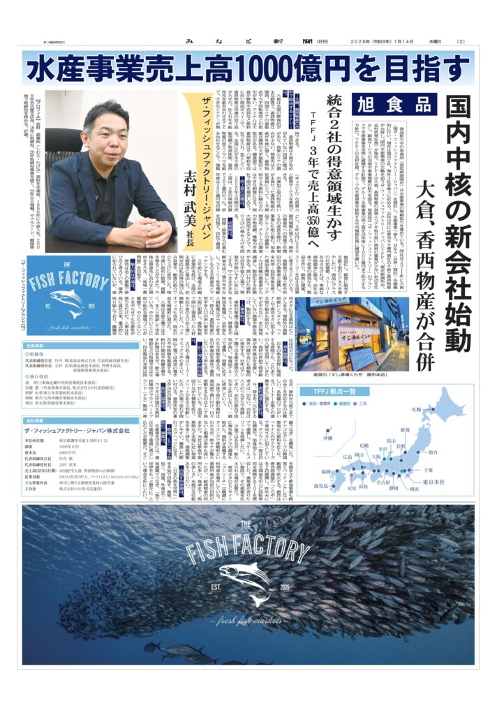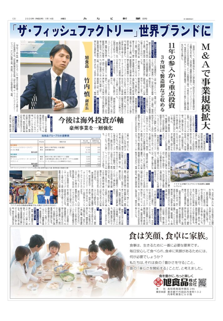 このたび、2026年1月14日付 みなと新聞において、当社(水産事業会社群)の取り組みが特集として掲載されました。