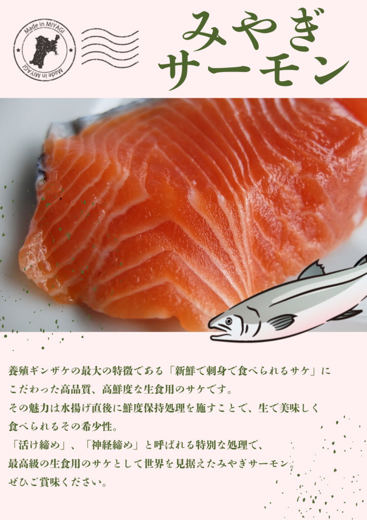 銀座鮭の発祥の地である宮城県で養殖された、高品質・高鮮度なサーモン。確かな養殖技術で大切に育てられた宮城ブランドの魚です。
