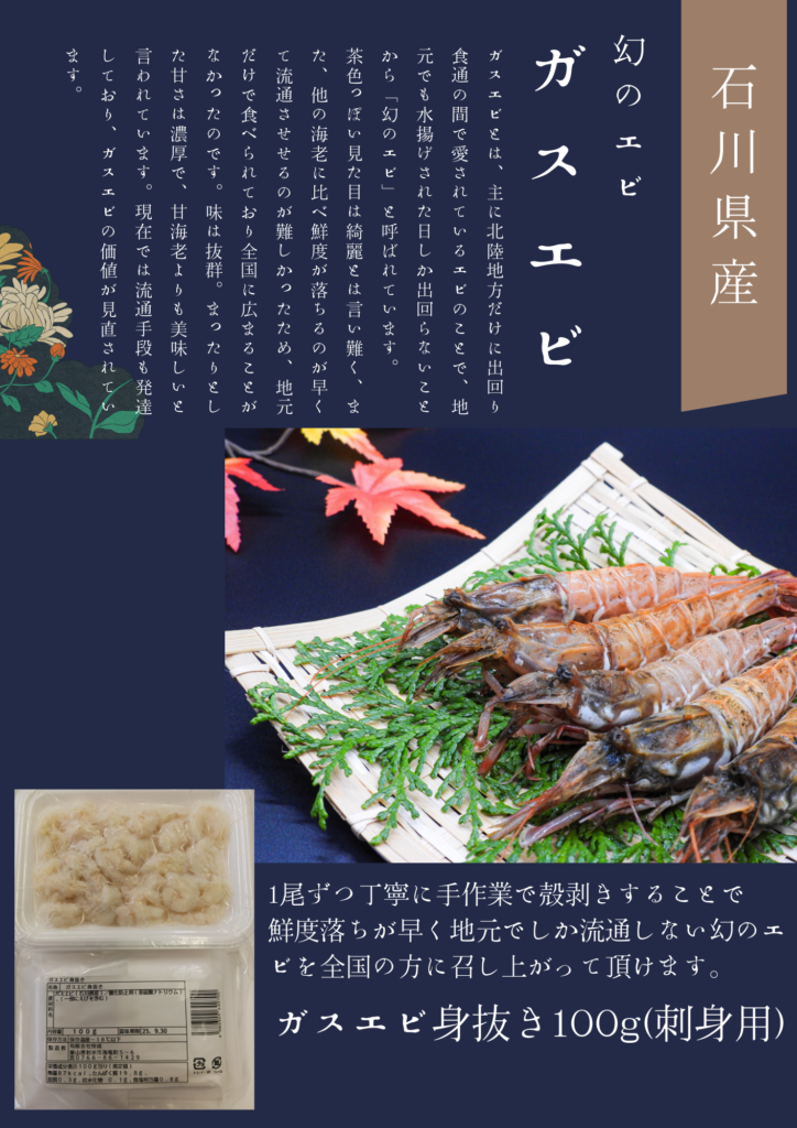ガスエビとは、主に北陸地方だけに出回り食通の間で愛されているエビのことで、地元でも水揚げされた日しか出回らないことから「幻のエビ」と呼ばれています。
