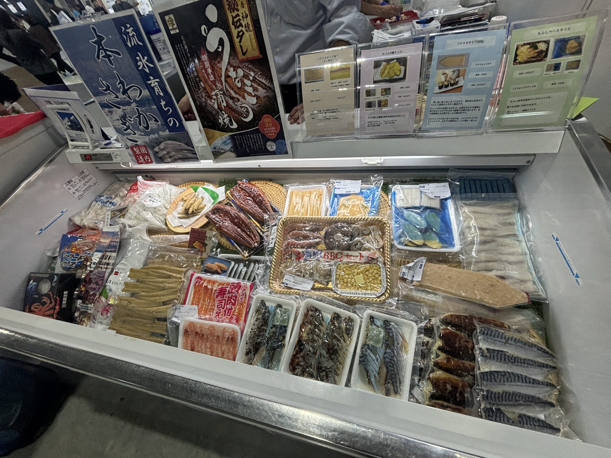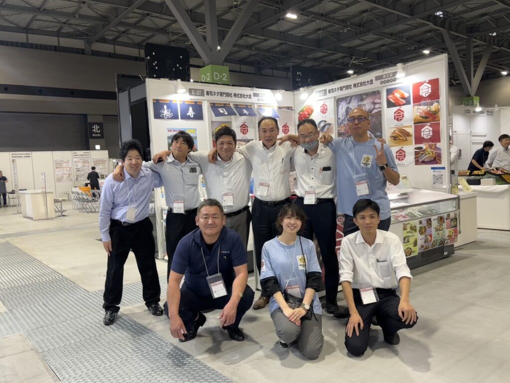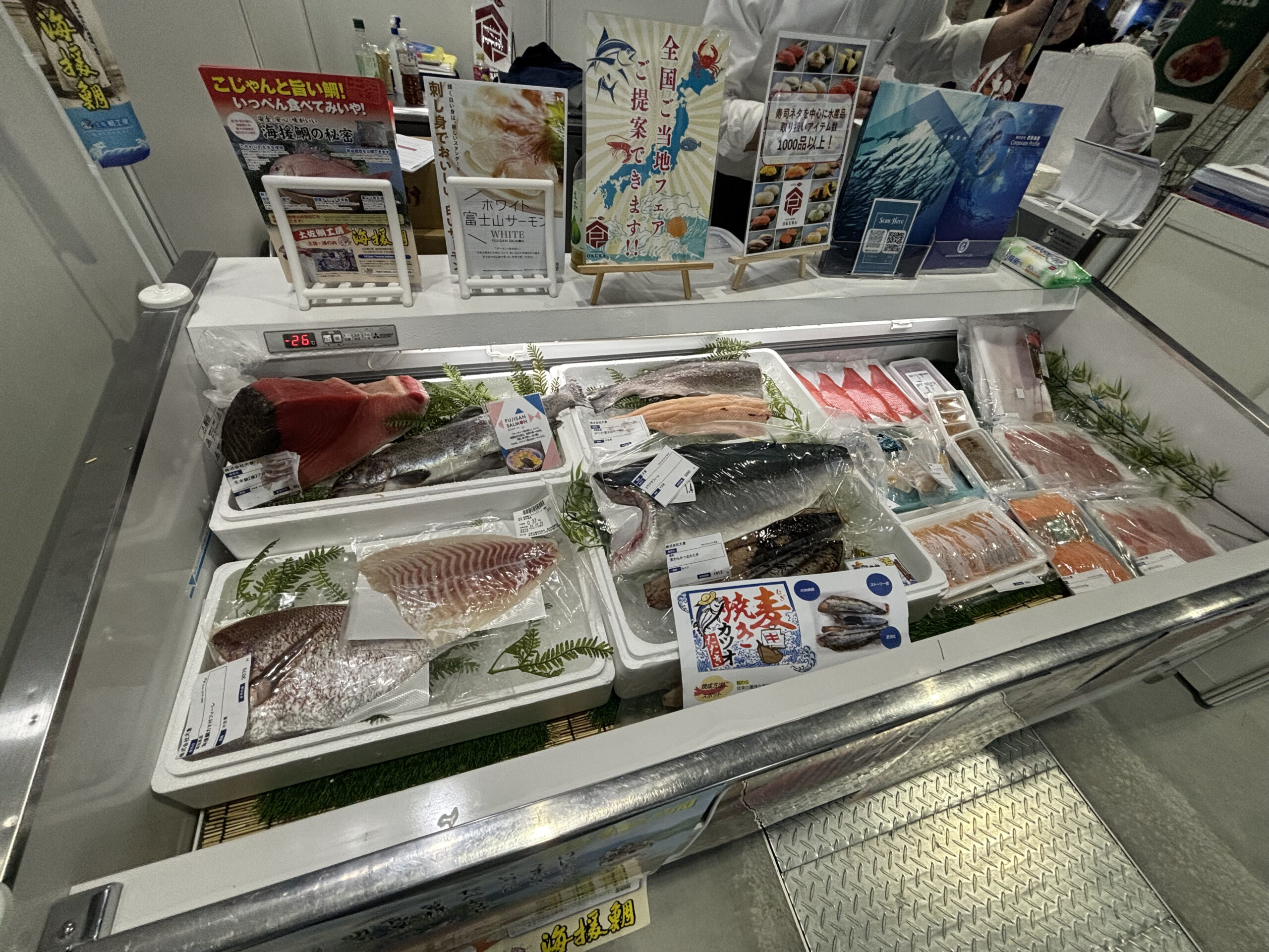 弊社出展ブースでは寿司ネタ商品を中心に、全国ご当地の冷凍水産物商品、オリジナル商品、など60近くのアイテムを展示。