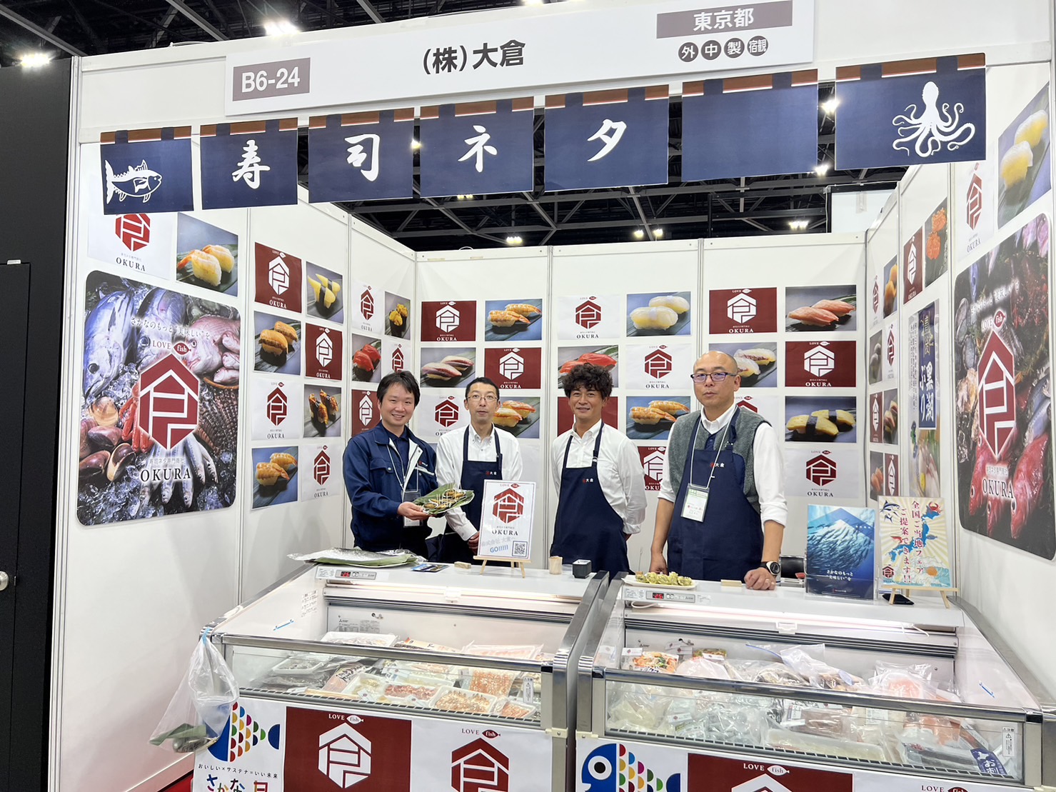 お寿司屋さんの暖簾風の飾りつけや商品ごとにPOPを張り付けるなど、大倉が寿司ネタ商社であると一目でわかるブースづくりを意識し、1,100社もある中で一人でも多くのお客様が来ていただけるようスタッフ一丸となって取り組みました。