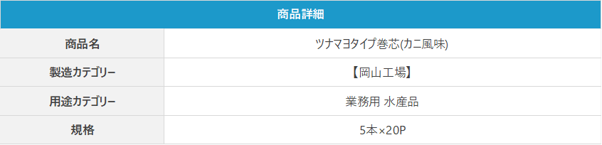 ツナマヨタイプ巻芯(カニ風味) 2025 11/04 2025年11月4日 【商品名】ツナマヨタイプ巻芯(カニ風味) ※規格・入り数は変更する事があります。 URLをコピーしました! URLをコピーしました!
