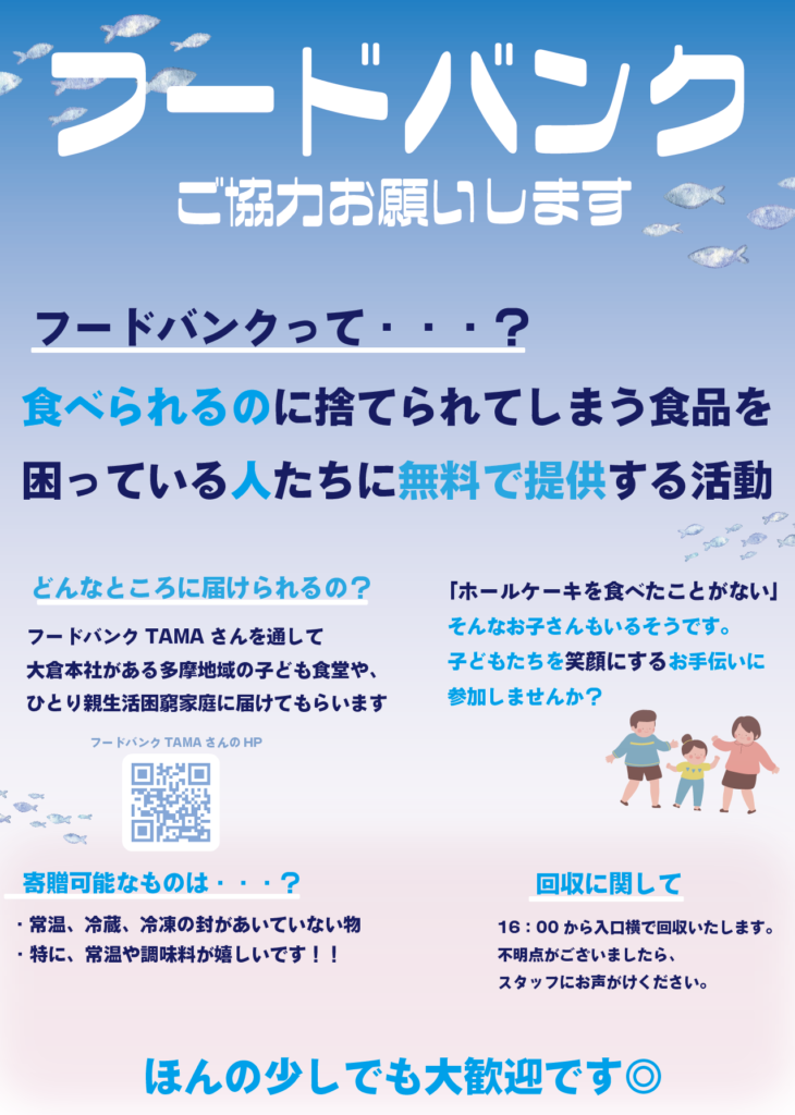 今年度から初の取り組みとして、フートバンクTAMA様ご協力のもとフートバンクを実施する運びとなりました。