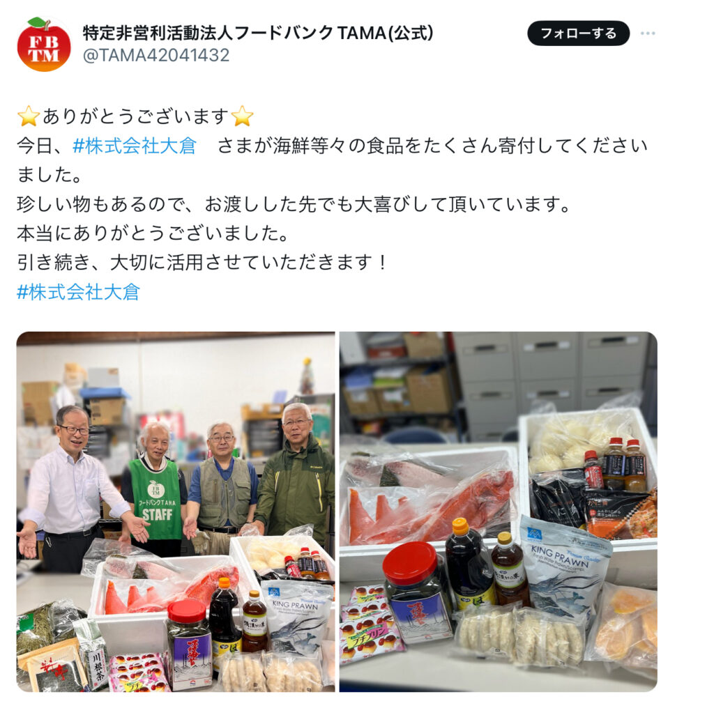 フードバンクTAMA様は、弊社のある多摩地域を中心とした児童福祉施設や子ども食堂、ひとり親家庭などに食品を寄贈する活動をしています。